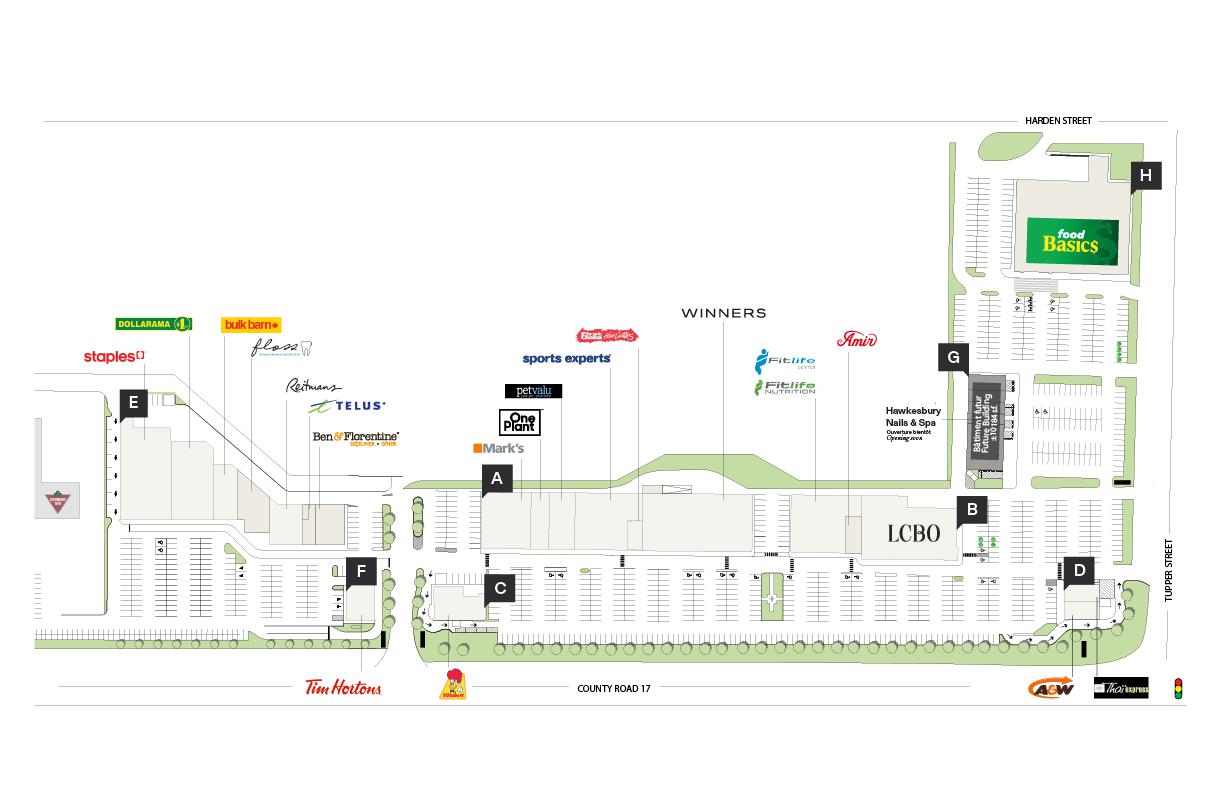Plaza Hawkesbury's strategic location contributes to its success. It is located directly along Highway 17 at the intersection of Tupper Street. Its proximity to Highways 40 and 417, as well as the border to Quebec ensures a steady flow of clients. The Hawkesbury General Hospital, a comprehensive regional hospital, is also located nearby. A major expansion of approximately $190 million was recently completed.